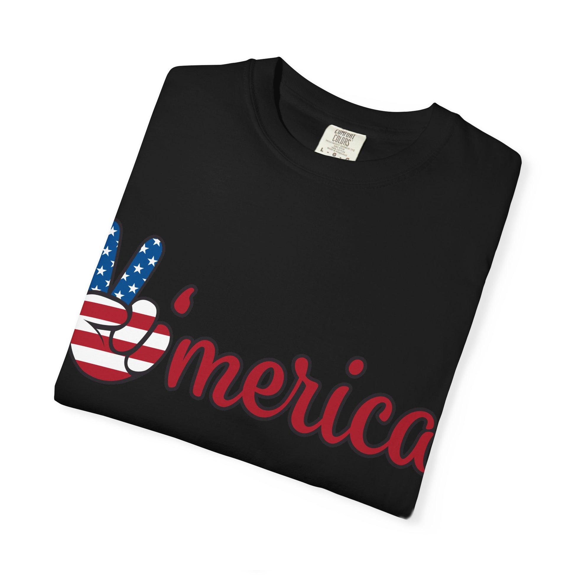 A soft, garment-dyed tee that wears in like an old favorite while showing quiet, confident patriotism. The front features a playful peace-hand graphic filled with the American flag’s stars and stripes that flows into a cursive ’merica — a relaxed, casual statement that reads like a wink rather than a shout. Built from heavyweight, ring-spun cotton and pre-shrunk for a dependable fit, this shirt drapes easily for everyday wear: backyard cookouts, neighborhood parades, or slow summer drives. The tubular knit and double-needle stitching give it a clean silhouette and long-lasting structure. Choose from many colors and sizes to match your style; the garment-dye process gives each shirt a lived-in softness and subtle depth of color.
